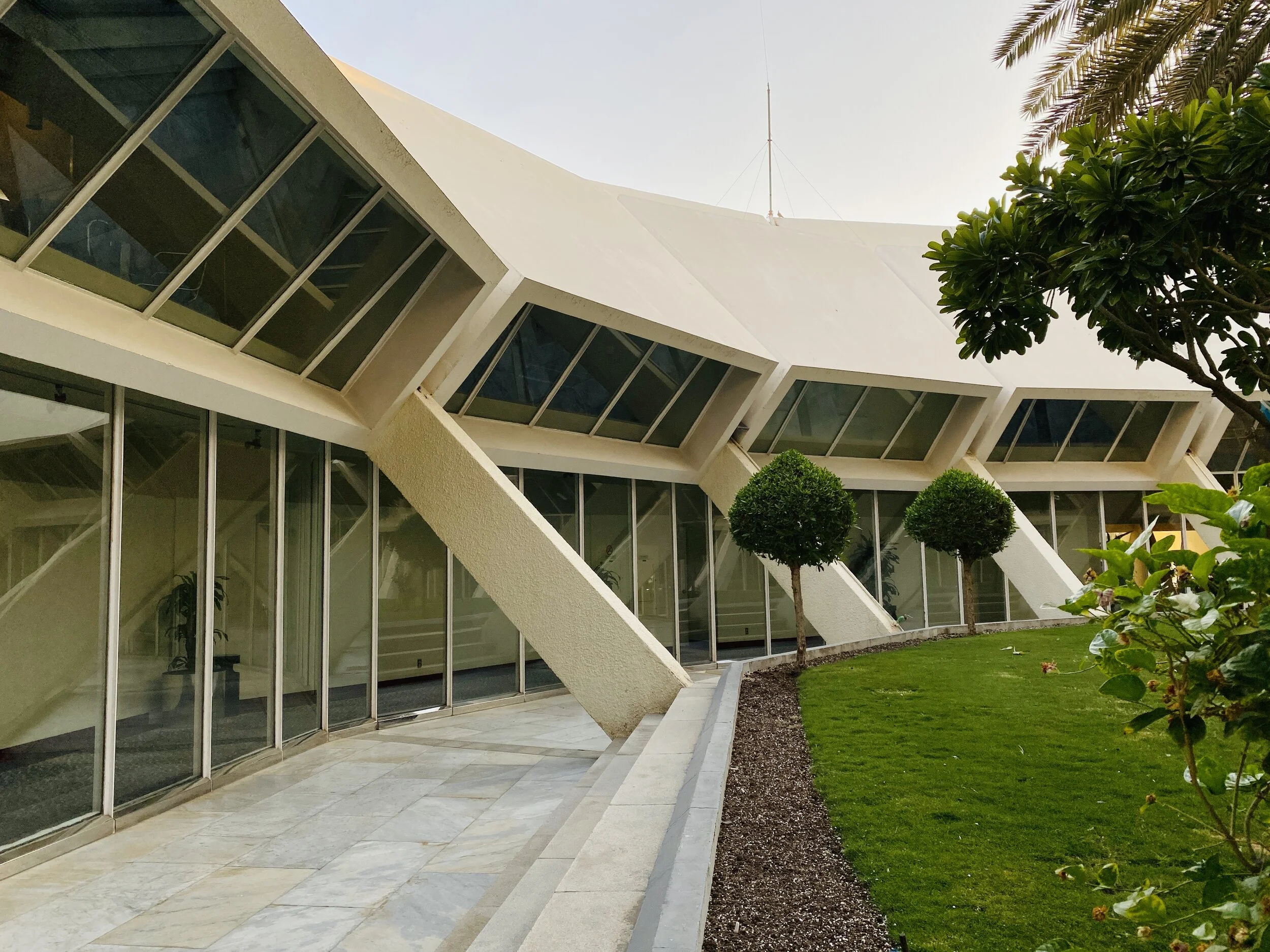 Situated between two parks in Al Malaz in Riyadh, in 1973 architect Frank Basil developed an equestrian members club to accommodate its neighborhood residents. The design focused on geometric manipulation, and thus created a dynamic structure of intersecting concrete walls, glass facades and tensioned membranes. This octagonal form reinforced the connection between interior and exterior spaces, allowing natural light to enter from all sides.