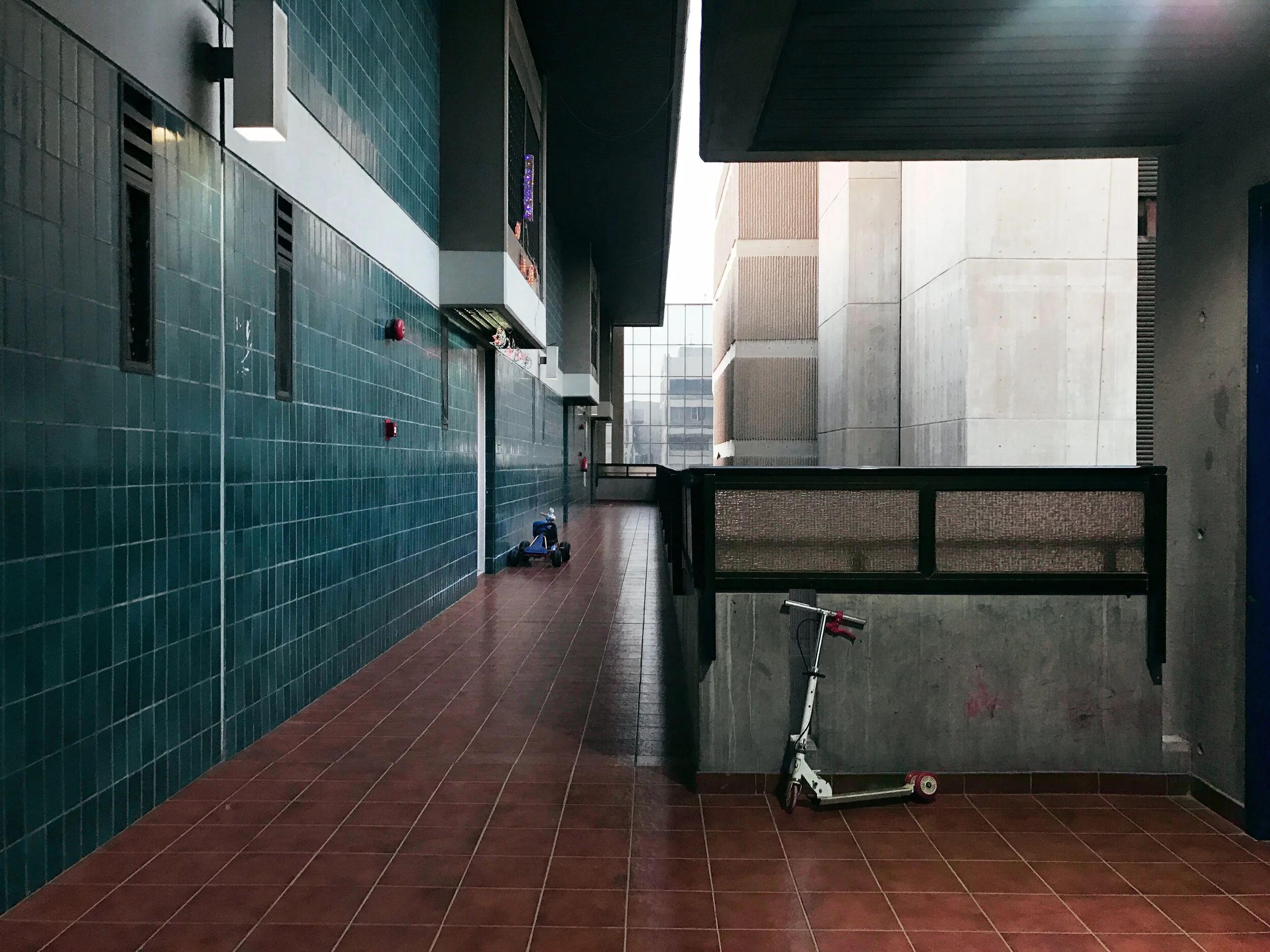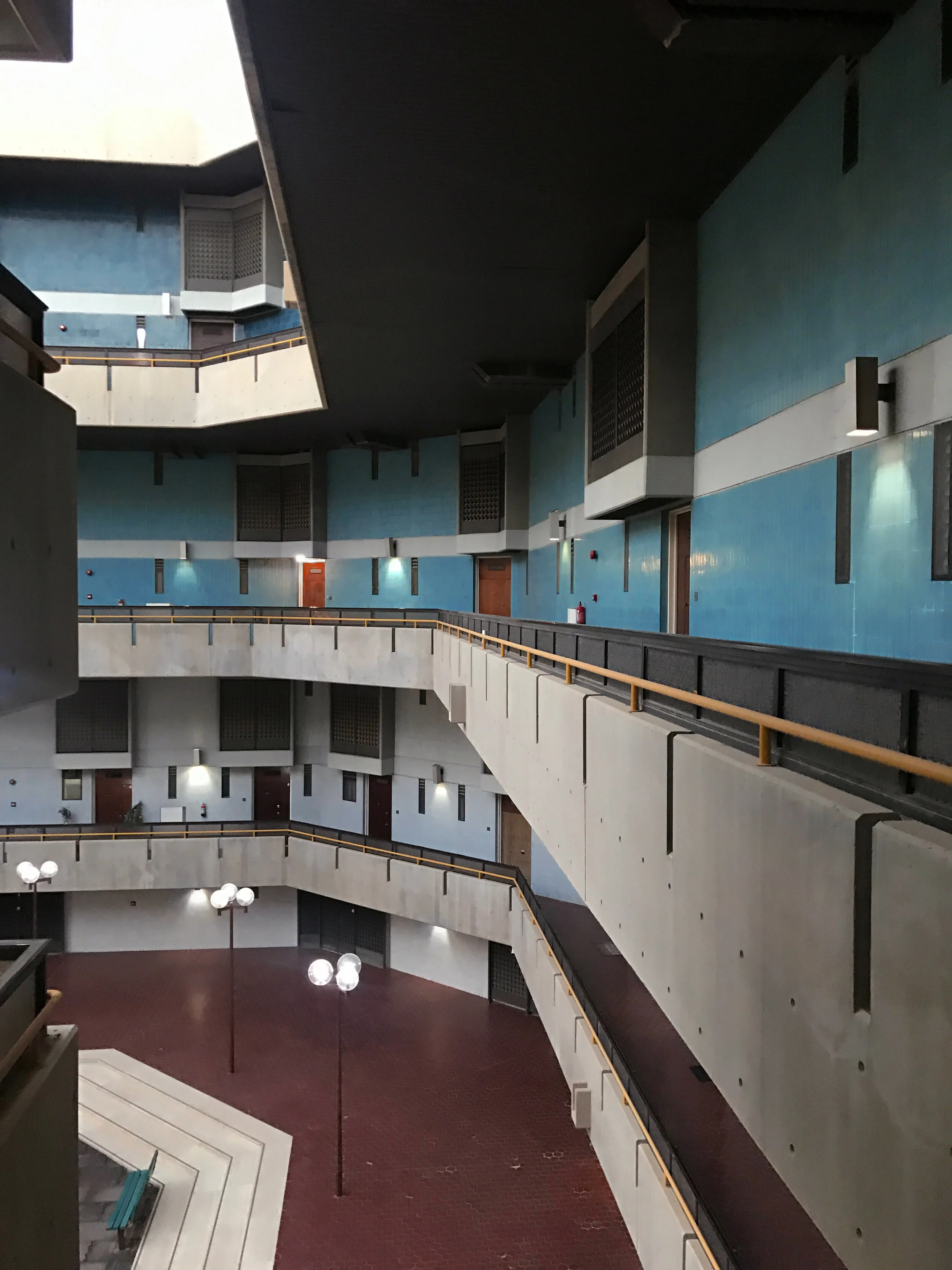 كما أن التقاء الممرات الخارجية مع السلالم أسهم في خلق عناصر تظلل على الباحة الخارجية التي تؤدي إلى مبنيان تجارية تتكون أيضا من سبعة طوابق.
