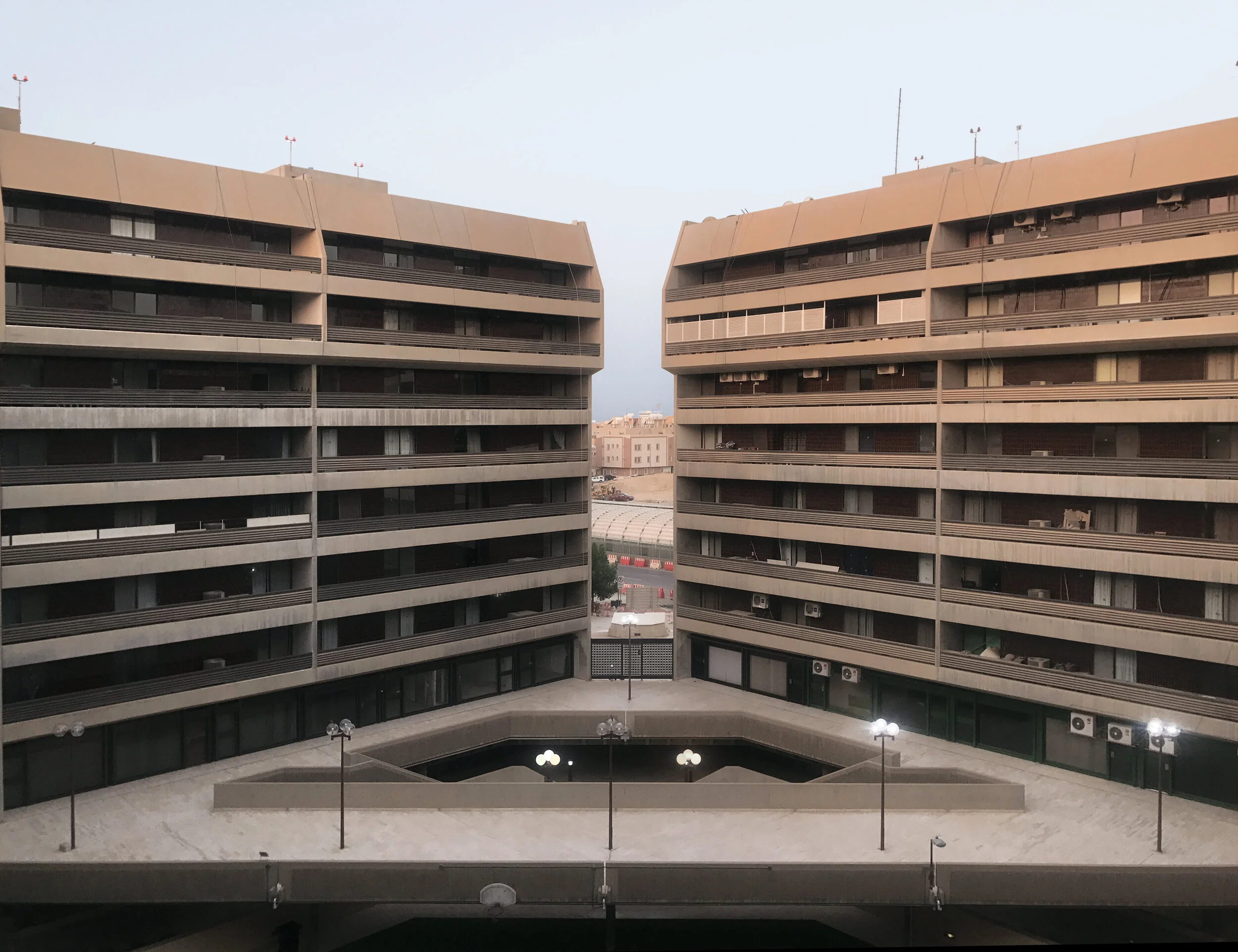 The GOSI housing building, situated in the midst of Sitteen Street in Riyadh, is a seven-story apartment building that lies within a mixed-use complex designed for the General Organization for Social Insurance (GOSI). The L-shaped residential structure steps back in an incline, allowing for multilevel private terraces for residents. Exterior walkways intertwine with stairways acting as shaded elements for outdoor courtyards, that connect to two identical 7- story commercial buildings. The 37,000 SQ development expresses the modernist versatile material that is concrete. Where it was adapted in multiple ways; including rigged panels within the facade, creating complexity and profundity within the complex.